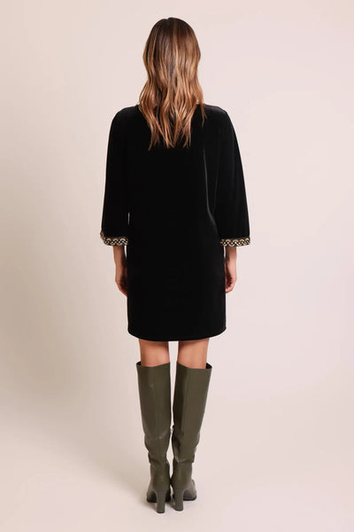 Effortlessly refined, the Bloom Dress brings a touch of understated glamour to your wardrobe. This tunic-style mini is crafted from soft black velvet and features 3/4 trumpet sleeves finished with intricate gold beaded cuffs that catch the light beautifully. A subtle back button closure and side seam pockets add thoughtful ease to the silhouette. Dress it up with heels or pair with tall boots for a look that feels both elevated and effortless.