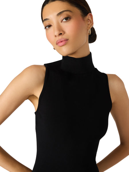 The Breslin Sleeveless Sweater Dress in Black is a gorgeous sleeveless mock neck knit mini with fitted body finishing in a drop waist.