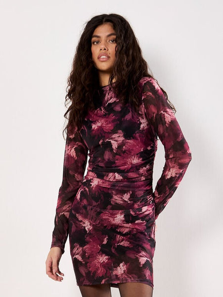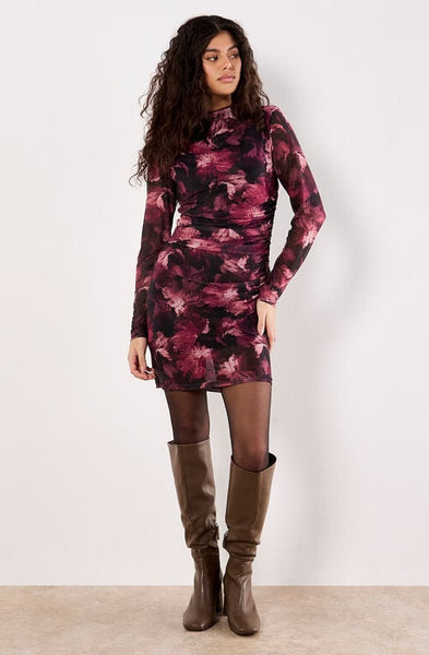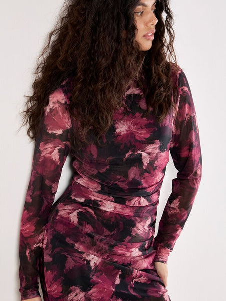 Turn heads in the Paintbrush Floral Mesh Dress, featuring a painterly floral print in rich maroon, pink, and purple tones against a black backdrop. Crafted from soft, stretch mesh and fully lined for comfort, this figure-hugging mini dress flatters with side ruching and a sleek mock neckline. Effortless yet striking, it’s the perfect piece to pair with heels for your next night out.