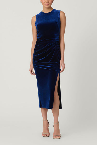 Elevate your evening wardrobe with the Viv Dress, crafted from sumptuous stretch velvet in a striking bright navy. A sleek crew neckline and fitted sleeveless bodice create a flattering silhouette, while the straight pencil skirt with a front slit adds a modern, elegant touch. Thoughtful draping at the waist and skirt brings dimension and movement, making this dress as sophisticated as it is chic.