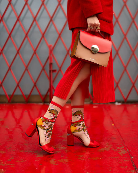 Celebrate Lunar New Year with the stunning Year of the Dragon sock, paying homage to our Founder's heritage. Two gold and red dragons mirror each other and intertwine, creating perfect symmetry from the front view and a full dragon from the side view. Cherry blossoms give this sheer dragon sock a feminine and unexpected touch. Pair with red shoes and wear all February, from Chinese New Year to Valentine's Day.