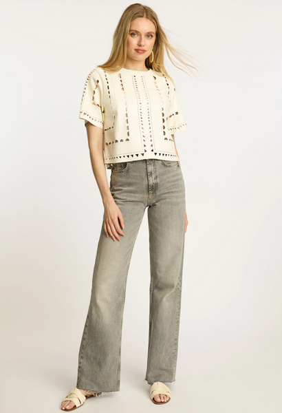 The Anisa Top in Antique White is a modern, standout piece with a chic, sustainable twist. Crafted from perforated vegan leather, it features geometric cut-out details that add texture and visual interest. With a relaxed, boxy fit, short sleeves, and a classic crew neck, this top blends effortless style with refined edge, making it perfect for both casual and dressier looks.