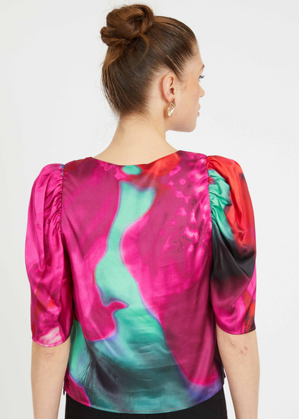 The Arden Top in the Blur Iris Bloom print brings a romantic, artful flair to everyday dressing. This lightweight blouse features a flattering V-neckline and softly ruched elbow-length puff sleeves for a touch of volume and femininity. The relaxed silhouette is elevated by subtle bust darts, providing a gently tailored fit through the top while maintaining fluidity through the body.