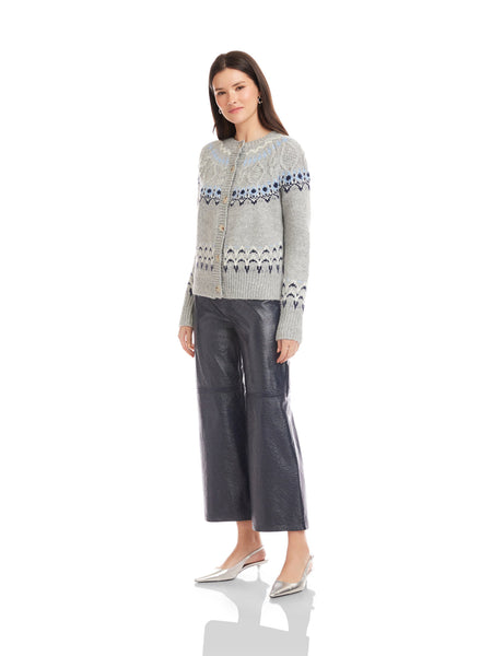 The Astrid Cardigan Sweater blends cozy comfort with timeless charm. Featuring a classic crew neck, raglan long sleeves, and a slightly cropped, relaxed fit, it layers effortlessly over any outfit. A soft Nordic-inspired Fair Isle pattern in light blue, blue, and white adds subtle artistry, while ribbed trims and a front button closure keep the look polished and structured.