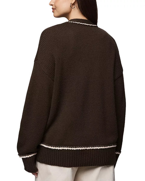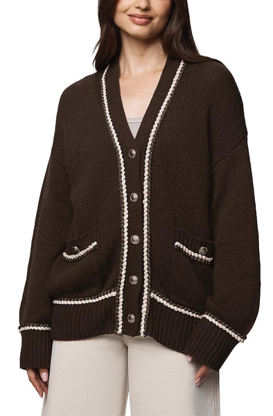 Elevate your cozy classics with the Brooklyn Cardigan, a relaxed V-neck style in a rich dark chocolate hue. The contrast braided trim, woven in white, brown, and a hint of gold thread, adds a touch of polish to this timeless layer. Finished with gold button closures, front patch pockets, and contrast stitching throughout, it’s an effortlessly chic staple for cooler days.