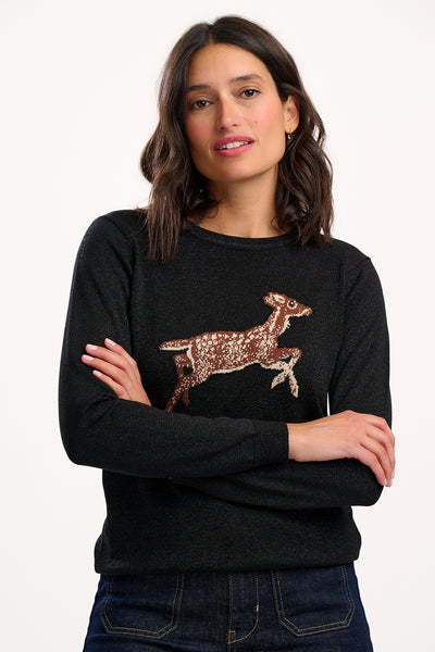 Add a festive twist to your wardrobe with the Rowena Jumper in Black Sparkling Deer. Crafted from sparkling lurex knit with metallic fibers, this full-length jumper features a straight-cut silhouette and ribbed trim for classic comfort. A playful intarsia deer design in brown and beige adds a whimsical, eye-catching touch, making it perfect for holiday gatherings or cozy winter days.