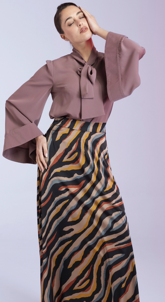 Feminine and bold, the Oversized Bow Blouse in Onion brings playful drama to your wardrobe. Crafted from soft crepe in a mauve hue, it features a statement wide bow tie collar, bell sleeves, and a button-down front. Perfect for pairing with tailored trousers or skirts, this blouse balances elegance with a touch of whimsy.