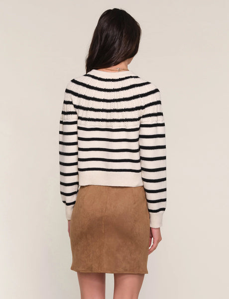 The Selene Cardigan is a crew neck, relaxed fit knit. It features a stripe layout with a cable stitch detail around neck. It also has cute, novelty buttons.