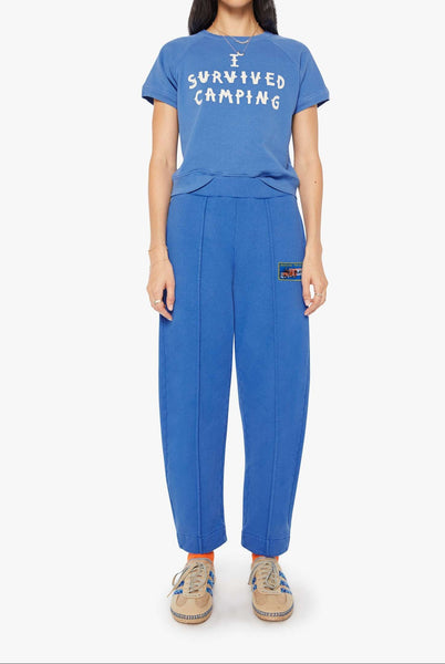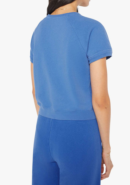 Happy camper. A short-sleeve raglan sweatshirt with a crewneck and a slightly shrunken fit. It's made from 100% cotton in blue with a white text graphic on the front.