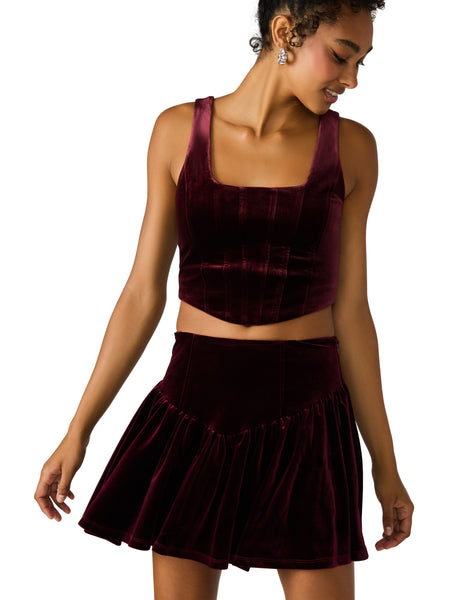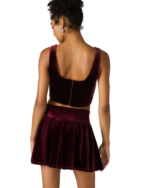 The Aryanna Top in Wine brings soft sophistication to your look. Crafted in plush velvet, this sleeveless cropped silhouette offers a smooth, flattering fit with a clean back zipper closure for ease. Wear it on its own for a bold finish, or pair it with the matching skirt to create a beautifully coordinated set with rich texture and modern polish.