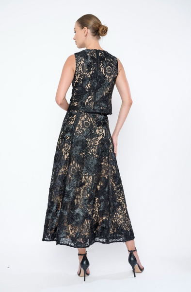 The Bello Top in Elderberry Lace is a vintage inspired sleeveless top with a delicate textured black floral lace overlayed against a subtle beige. This timeless piece pairs with black trousers, dark denim and the matching skirt seamlessly. Perfect for winter weddings and holiday parties.