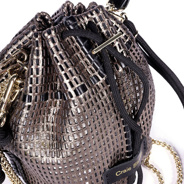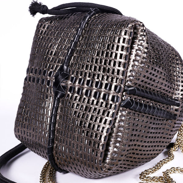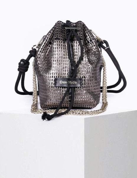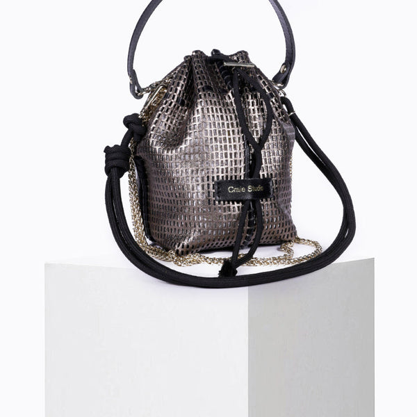 The Bibi Lunar bag is a mini bucket bag with a bold design, handmade in Craie Studio's Casablanca workshop. Crafted from perforated Lunar lambskin, it boasts a lightweight structure, unique openwork style, and an urban look that makes it a must-have fashion accessory. The Lunar colorway is a metallic taupe, somewhere between bronze and silver, and pairs well with brown, black, or gray. Perfect as a day or evening bag, the Bibi is a compact it-bag that combines craftsmanship, quality leather and contemporary style.