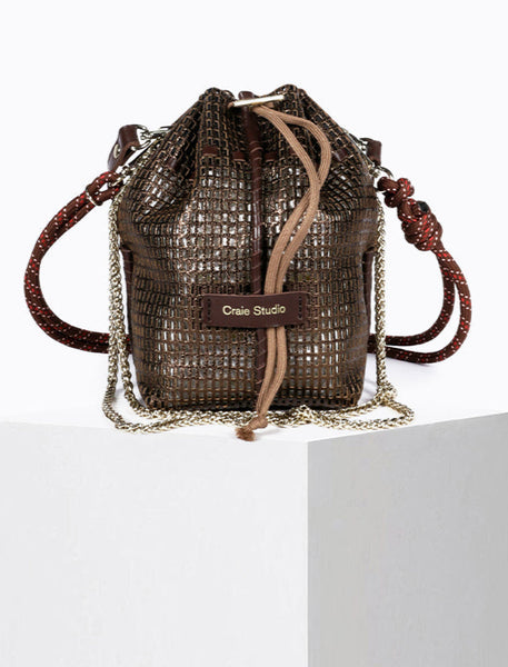 The Bibi Mambo bag is a mini bucket bag with a bold design, handmade in Craie Studio's Casablanca workshop. Crafted from perforated bronze metallic lambskin, it is braided in Choco leather. Its lightweight structure, unique openwork style, and urban appeal make it a must-have fashion accessory. Perfect as a day or evening bag, the Bibi is a compact it-bag that combines craftsmanship, quality leather and contemporary style.