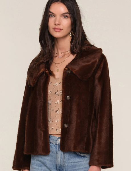The Claudine Jacket is a cozy, luxe faux fur layer with an oversized collar and relaxed fit. Featuring charming novelty buttons, it adds instant style to any outfit. Pair it with a simple sweater and jeans for an effortlessly chic, cool-girl look.