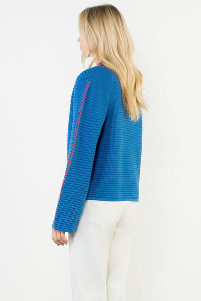 Brighten your fall/winter wardrobe with this vibrant textured blue cardigan. Designed with a soft, waffle-knit feel, it offers both comfort and a modern look. The bold red piping adds a lovely contrast in a fun color combination.