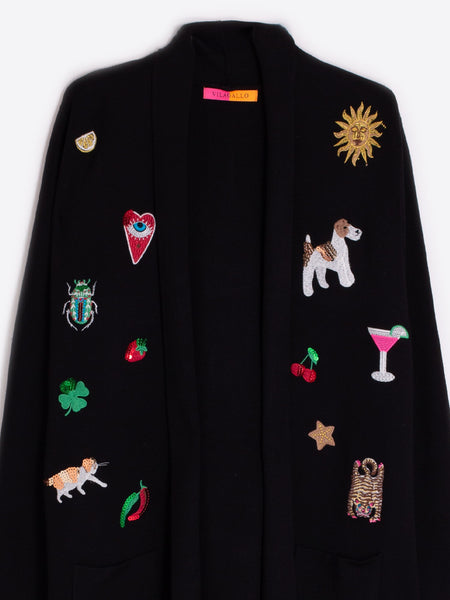 Long black cardigan with multicolored decorative embroidery on the front. It features a fringed hem and patch pockets on both sides of the front. Straight cut without closure, with a shawl-style collar. The fabric has a medium body and a soft feel.