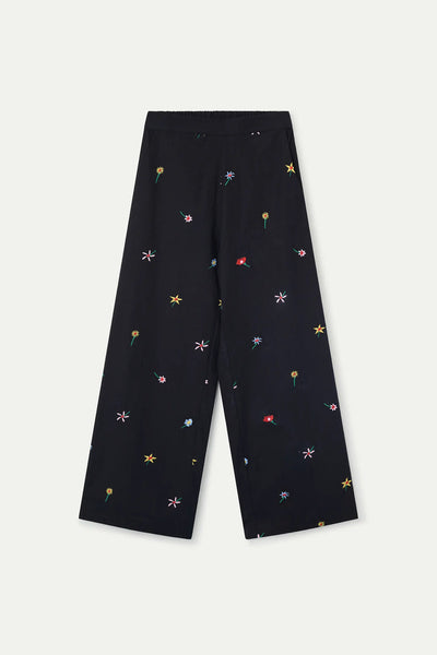 Add a touch of effortless style to your wardrobe with the Embroidered Gardener Trouser in Black. Featuring a colorful floral embroidery, straight-leg silhouette with a mid-rise fit and an elastic waist. The flat paneled front waistband provides structure, while side pockets add everyday practicality. A versatile staple perfect for laid-back days or dressed-up moments paired with the matching sleeveless top.
