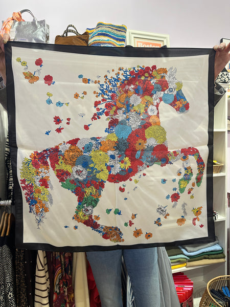 The Equine scarf features a striking design of a horse formed by a vibrant arrangement of flowers and leaves. The colorful blooms flow dynamically from the horse’s mane and hooves, creating an elegant and artistic impression. Perfect for adding a nature-inspired touch to any outfit, this scarf blends creativity with wearable art.