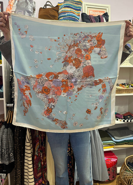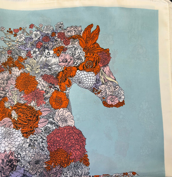 The Equine scarf features a striking design of a horse formed by a vibrant arrangement of flowers and leaves. The colorful blooms flow dynamically from the horse’s mane and hooves, creating an elegant and artistic impression. Perfect for adding a nature-inspired touch to any outfit, this scarf blends creativity with wearable art.