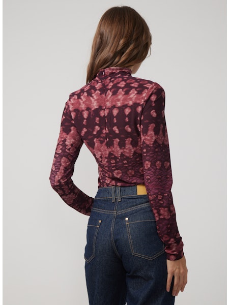 Make a statement with the Evie Top in Echo Valley. Featuring a striking plum, burgundy, and pink bleach/ink blot pattern, this fitted turtleneck offers a sleek, modern silhouette. Long sleeves and a back zipper closure ensure a polished finish, making it perfect for layering or wearing solo for a bold look.