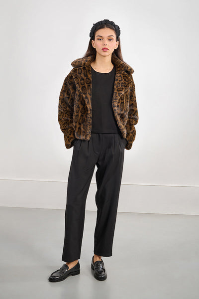 Make a bold statement with this Faux Fur Jacket in Leopard in rich brown tones. Designed with a wide shawl collar and a short, boxy silhouette, it brings both warmth and effortless glamour to your look. The plush faux fur and full lining create a luxe feel, while the snap button closure keeps the fit sleek and modern. Perfect for adding a touch of wild sophistication to any outfit.
