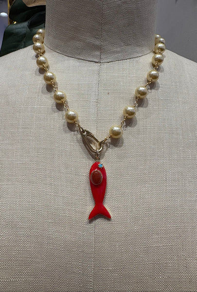A playful twist on ocean elegance. This necklace features a pearl chain and a vibrant enamel gem fish, delicately hooked as if caught mid-swim. A unique touch of whimsical fun for any jewelry collection.