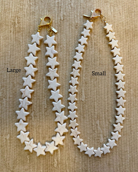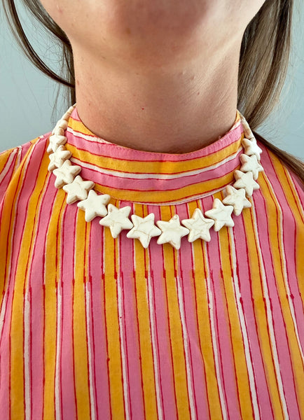 The Large Sea Star Necklace in Coconut by Smith and Co is a bold, playful statement piece infused with coastal charm. Designed with large star-shaped malachite beads in a soft cream, this eye-catching necklace brings the designer’s signature Southern-inspired style to any look. Finished with a 14k gold-plated lobster clasp and extender for the perfect fit, it’s the ultimate necklace for sunny days and standout nights. Fun, colorful, and made to turn heads.