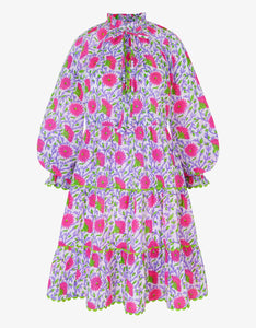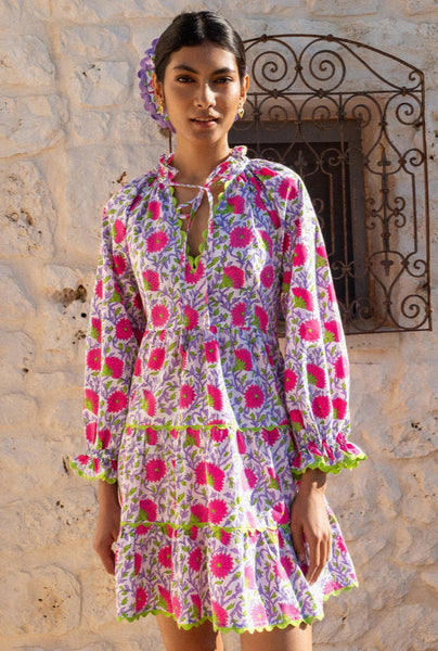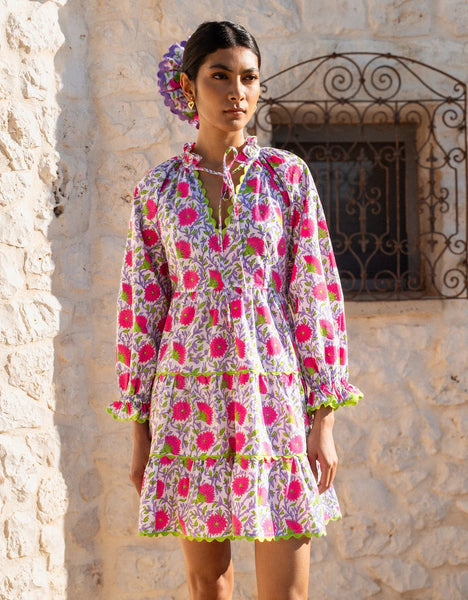 Fun, playful, and bursting with bold color, the Neon Camelia Luna Mini is a true statement piece. Hand block-printed on organic cotton in vibrant purple and green with striking neon pink florals, this dress is designed to stand out. Featuring a high frill neckline with tie-bow details and voluminous balloon sleeves finished with contrasting green ric-rac, it’s perfect for those who love a little drama in their wardrobe. Its the perfect beach throw on!