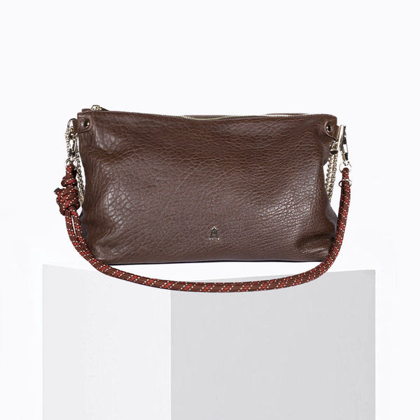 The Mallow is Craie Studio's ultimate soft and chic bag, here available in Brown bubble leather, with a natural grain and a soft feel. Designed to adapt to all your desires, it seduces with its generous size and its modularity: carried on the shoulder, by hand, or as an oversized clutch, it transitions easily from everyday to more formal occasions. Its supple, generous silhouette is enhanced by a golden chain for a chic look and an adjustable climbing rope for a more daring touch.