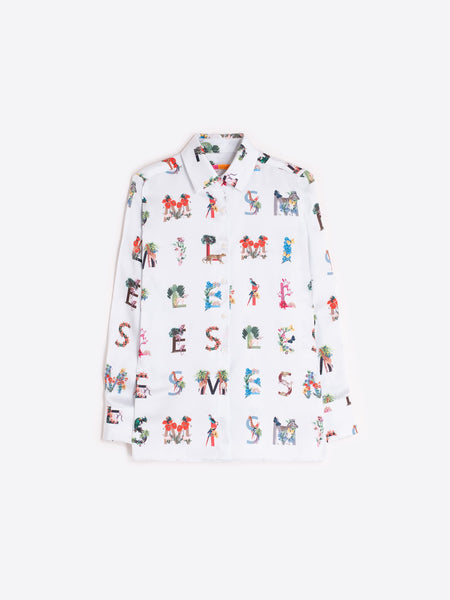 Brighten your day with the Mariela Smile Shirt in White. This straight-cut shirt features a playful multicolor letter print spelling out “SMILE” across the front. Designed with a classic collar, front button closure, and buttoned cuffs, it offers a timeless, tailored look with a cheerful twist. Perfect for adding a pop of personality to any outfit.