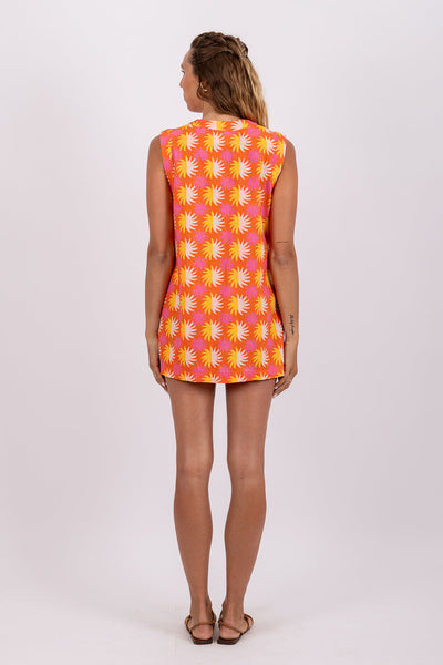 The Nadege Dress is a retro-inspired sleeveless mini dress crafted from an exclusive floral print in vibrant shades of orange, yellow, pink, and white. Designed in a classic shift silhouette, it features a button-down front adorned with eye-catching gold shell buttons and flap patch pockets for a touch of vintage charm. Complete with a matching belt that doubles as a headband, this versatile piece brings playful elegance to sunny-day dressing.