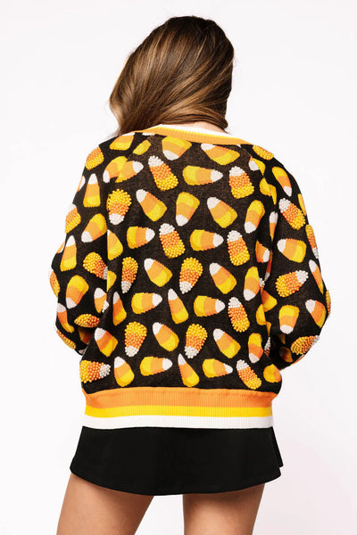 The Candy Corn Cardigan needs no introduction. This stunning piece blends rich black hues with pops of candy corn colors, perfect for all your Halloween season needs. Soft and snug, it’s ideal for chilly days when you want to stay warm without sacrificing style. Enjoy the perfect mix of sweetness and edge all season long!