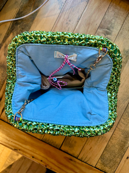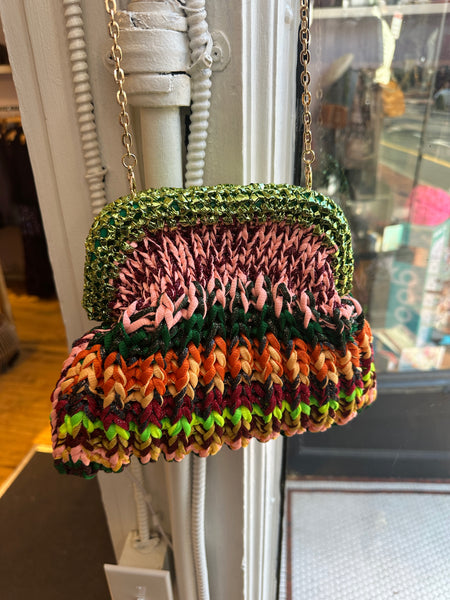 It was love at first sight when we laid eyes on Turkish designer Nadia Dafri's candy colored handbag collection. Designed in Paris and made by hand in Türkiye these bags are all one of a kind and super special. Each clutch is hand-crocheted with a gleaming gold chain strap and ombré woven body in shimmering tones. Its softly structured shape and intricate texture lend a vintage-inspired yet modern artisanal charm — perfect for evening gatherings or resort wear.