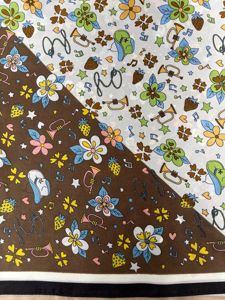 A playful and colorful pattern featuring a mix of flowers, strawberries, musical notes, trumpets, hearts and stars on contrasting light backgrounds. The lively combination of elements creates a cheerful and whimsical design, perfect for adding a fun and energetic vibe to any outfit.