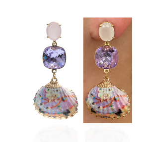 Ekaterini is a stunning new line to Mint Julep all the way from Greece. These stunning earrings feature natural shells hand painted in gold, shimmering Swarovski crystals, 22k gold plating, semiprecious oval stone post and are nickel/lead free. We love how these amazing pieces add the perfect summer shine to any outfit.