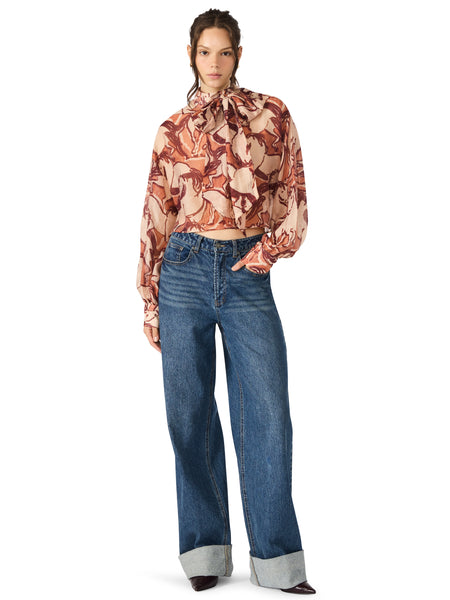 Make a bold statement with this sheer printed blouse, featuring an artistic wild horse motif in earthy tones of rust, rose, and cream. Designed with a dramatic self-tie bow at the neckline, it offers a feminine touch with a modern edge. The voluminous long sleeves are finished with buttoned cuffs, while the cropped, relaxed silhouette makes it perfect for pairing with high-waisted denim or tailored trousers. Lightweight and flowy, it’s a standout piece for day-to-night styling.