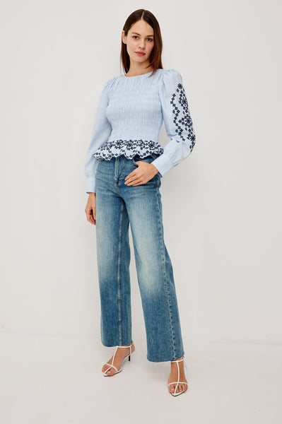 The Tabi blouse embodies sophisticated charm in crisp, lightweight poplin, featuring a smocked body, long puff sleeves with fitted cuffs, contrast embroidery at the sleeves and peplum hem, and a back keyhole with loop-button closure.