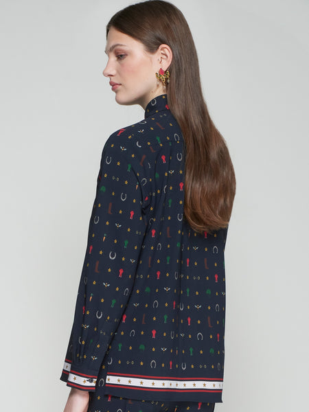 Bring a touch of playful sophistication to your wardrobe with the Tea Shirt, a navy button-down adorned in a full equestrian-inspired print featuring riding boots, carrots, ribbons, medals, bees, horseshoes, and stars. Designed with a classic collar and concealed button placket, it offers a timeless silhouette elevated by unexpected details. The striped hem and cuffs provide a bold contrast, while side splits ensure a relaxed, easy fit. Perfect for pairing with tailored trousers or denim, this shirt blends whimsy with polish for effortless everyday style.