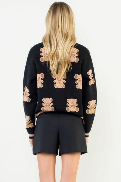 Playful meets cozy in the Teddy Bear Knit Cardigan in Black. Crafted with a soft intarsia knit featuring charming brown and tan teddy bears, this cardigan brings a nostalgic, statement-making touch to your cold-weather wardrobe. The striped trim and woven leather buttons add a polished contrast, giving it a vintage-inspired finish that feels both whimsical and chic. Style it with denim for an off-duty look or layer it over a dress for a playful twist on classic knitwear.