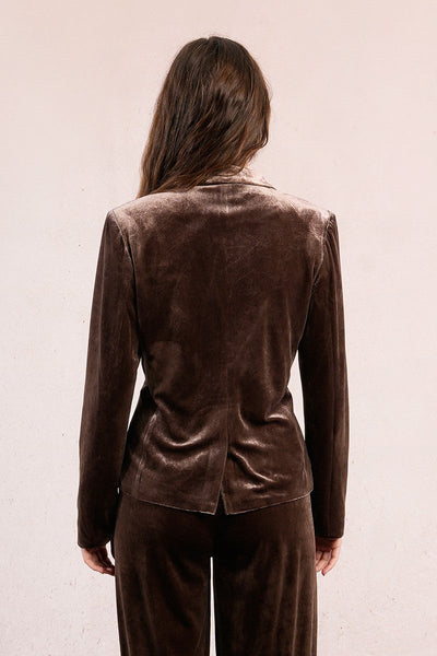 The Velvet Blazer in Brown brings timeless sophistication with a touch of modern ease. Crafted in plush velvet, it features a straight silhouette with a wide tailored collar and front button closure for a polished finish. Designed with welt pockets and long sleeves, this fully lined blazer pairs perfectly with the matching trousers for a refined, coordinated look that transitions effortlessly from day to night.