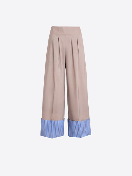 The Vuelta Rayas Trouser in Beige feature a full length wide-leg trousers with front pleats, a flat front waist panel, an elastic waist in the rear for comfort and a contrast cuffed hem in light blue striped fabric. We love how Vilagallo takes these classic trousers and adds a playful, unexpected twist.